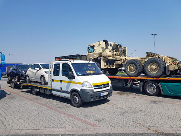 Holowanie pojazdów, laweta, uruchamianie i przewożenie samochodów osobowych, maszyn rolniczych i budowlanych.